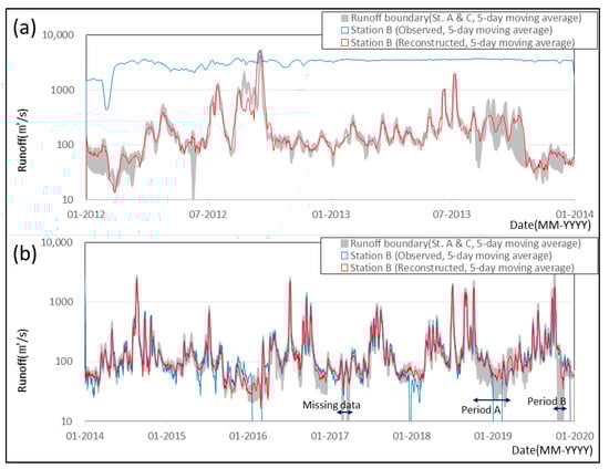 The abnormal runoff series from 2012 to 2019 in station B were reconstructed using an established ANN model with VMD, and its results are shown in Figure 7. For their visibility, reconstructed and observed runoff values are expressed as a 5-day moving average, and the runoff boundary, which is explained with high and low runoff values of stations A and C, are also plotted to compare with station B.