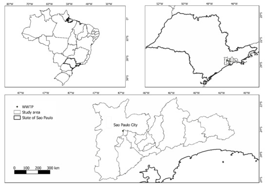 The information regarding the plant was gathered with the support of the São Paulo State Water Supply and Sewerage Company (SABESP), who owns and operates this facility. The wastewater treatment plant ABC is located in São Paulo city (23°36′41.58′’ S and 46°35′9.24′’ W) (Figure 2). This facility treats sewage from six cities, totalizing an approximate population equivalent of 1.4 million inhabitants.