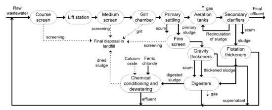 Diagram of the wastewater treatment plant ABC with all the treatment processes and flows. Notes: Wide arrows: Liquid state; dashed arrows: Solid state; thin arrows: Gaseous state. On the final arrows that do not have continuity in another unit operation: Final effluent, part is discharged in the river, part is conducted to a non-potable water reservoir, and part is sent to the Aquapolo Project; scum from settling tanks is conducted to digesters or disposed in landfill.