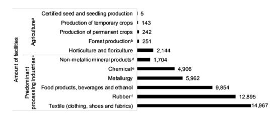Predominance of agricultural and industrial activities in the surrounding area of the wastewater treatment plant. Notes: (a) Based on the Brazilian Institute of Geography and Statistics (IBGE) [38]; data refer to 2017; (b) it includes planted and native forests; (c) based on [39]; data refer to January to September of 2019; the automobile sector is not included. Other sectors were not included because they are not highlighted in the Great ABC region [40]. Other sectors correspond to the mechanical industry; electrical and communications industry; transport material industry; wood and furniture industry; paper, cardboard, editorial, and graphic industry; and footwear industry (23,390 facilities in total); (d) manufacturing of materials such as cement; (e) industries such as pharmaceutical, veterinary, perfumery, and others; (f) smoke, leather, fur, and similar industries.