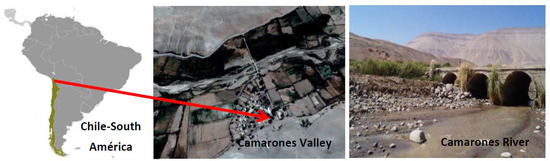 Camarones Valley is a village in the Arica and Parinacota Region, Chile, in southern South America, according to geo referencing 7897802.821 North–409758.221 East, Datum World Geodetic System 1984 (WGS 84) (See Figure 1). This town as an interior desert climate; it is located in the pampas, is over 1000 m above sea level, without coastal oceanic influence. In addition, the Camarones Valley is characterized by being very arid, with almost zero annual rainfall, and with average temperatures that reach 18 °C. Moreover, the days are mostly filled with clear skies and luminosity. It is drier than the coastal desert climate, with an average relative humidity of 50% [11]. On the other hand, this valley is crossed by the Camarones River, immersed in the basin of the same name; it has an area of 4767 km2 with a length of 135 km. It is formed by the confluence of the Ajatama and Caritaya rivers, in the Arepunra sector, in the Andes mountain range, at an altitude of 2900 m above sea level. Both tributaries have volcanic influence, from the Chuquicamata (5590 m) and Anocaire (5050 m) volcanoes [14]. In addition, its waters are characterized by having elements and compounds at high concentration, such as total dissolved solids, arsenic, and boron, whose quantities are 1500 mg L−1 [15], 1 mg L−1, and 10 mg L−1 [16], respectively.