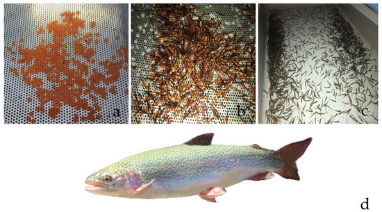 (a) Eggs, (b) larvae, (c) juveniles of Oncorhynchus mykiss, and (d) adult specimen, (photographs: own source).