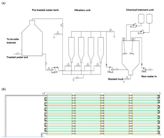 (a) Schematic design of the filtration-coagulation water treatment plant. (b) Solar compound parabolic concentrator (CPC) reactors to be connected to the filtration unit (proper elaboration).