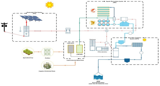 Figure 6 shows the implemented system, which, through the three main components (solar water treatment plant, aquatic recirculation system and photovoltaic), considering the principles of the circular economy, can aspire to sustainability. The diagram of the integrated aquatic recirculation system plant begins with the generation and distribution of electrical energy obtained out of the Photovoltaic plant. Subsequently, the solar water treatment plant system produces 9 m3 day−1 of treated water and generates 1 m3 day−1 of liquid waste, which is sent to the desiccating pools for liquid waste. The treated water enters the trout and shrimp ponds in a first cycle, then the water begins to recirculate, passing through a filtration system. Once a day, the product is removed from the conical decanters and sent to the aerobic nitrifiers and then to the liquid waste drying pond.