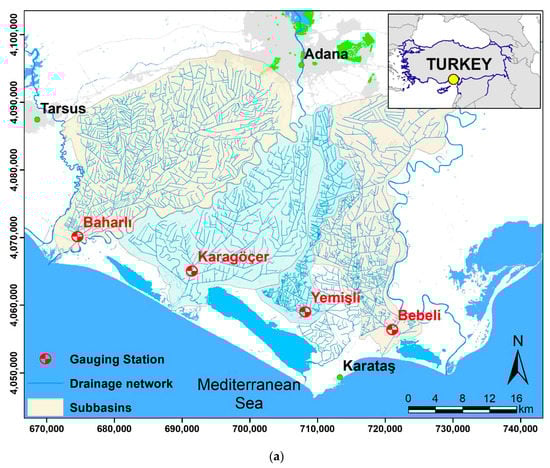 Location of the Lower Seyhan Plain (a) and the gauging stations used in the study (b).