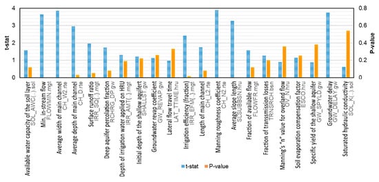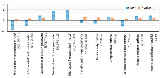 Flow and NO3 parameter sets were selected in the SWAT-CUP calibration procedure, and the model was initially run 500 times. In the global sensitivity analysis, the number of parameters was decreased to increase the calibration efficiency. While determining the parameters sensitive to these changes, the difference between the t-stat value (the coefficient divided by the standard error of a parameter) and the P-value (testing whether each parameter coefficient is equal to zero) was considered. The outputs of the global sensitivity analysis applied in the study for flow and NO3 are given in Figure 4 and Figure 5.