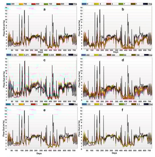 The global analysis identified the channel parameters (channel width, length, and depth) as most sensitive and the HRU parameters as least sensitive for the flow-related parameter. As a result of these analyses, 35 sensitive parameters were set for flow data, while 11 parameters were set for NO3. Moreover, SWAT-CUP was run separately for each parameter, and the sensitive parameters were determined by temporal precision (Figure 6). The calibration procedure was carried out five times for each parameter, where the most sensitive ones were determined. The main reason for the sensitivity of SWAT to the channel parameters was the region’s flat topography.