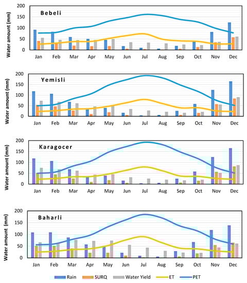 The simulated amount of water passing from the soil to the shallow and deep aquifers was limited. Discharge from groundwater to the stream was also low due to the impermeability and porosity structure of the clay soil. Annual total surface runoff was estimated between 244 to 374 mm, and surface runoff and precipitation ratio ranged from 30% to 45%, which can be considered reasonable for a Mediterranean region [22]. The total water yield was estimated as 513 mm for Yemisli sub-basin, whereas the highest runoff was estimated in the Karagocer sub-basin. Monthly water distributions of the sub-basins are given in Figure 7.