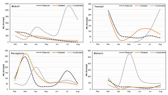 It was also observed in the modeling that a small amount of nitrogen accumulated in the soil transferred to main drainage channels. The main reasons are assumed to be flat topography, clay soil structure, structural features of drainage channels, and water mobility. As a result, the calibration and validation graphs showed that the non-calibrated nitrate values were considerably lower than their observed data. The accumulation of NO3 in the soil was ignored in model settings in calibration and validation. In this way, satisfactory results were derived in the validation of the sub-basins.