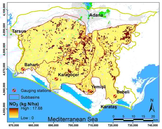 The amount of applied fertilizers was high in the areas with extensive agriculture. Most of the applied fertilizers were accumulated in the soil, while some were uptaken by the plants. According to the model outputs, the mean annual NO3 rate in the soil of the Bebeli sub-basin was 1.931 kg N/ha. In this sub-basin, the highest NO3 amount was defined as 17.68 kg/ha as nitrate content in citrus plantations of the Incirlik subregion and whereas the lowest was 0.1 kg N/ha in Arikli. The mean annual total NO3 in the soil of the Karagocer sub-basin was 1,895 kg N/ha, and the NO3 rates ranged from 0.01 to 15.22 kg N/ha. The mean annual total NO3 in Yemisli and Baharli sub-basins are 1.486 kg N/ha and 1.500 kg N/ha, respectively. The NO3 maps of the sub-basins derived from the SWAT simulations are given in Figure 11.