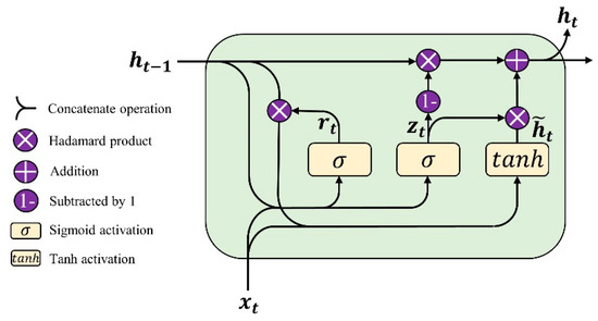 The GRU cell [44] contains two gate units (three gates in some of the literature [59], which include the output gate): the update gate and the reset gate. The internal structure of a primary GRU cell is shown in Figure 2. The unimportant information in the hidden state from the previous time step can be discarded through the reset gate. In contrast, useful information will be retained to affect the current hidden state. The whole forward propagation steps are as shown in Equations (3)–(6):