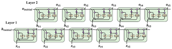 The combination of several layers of the basic LSTM or GRU cells may enhance the model’s ability when learning the nonlinear relationships and provide a better prediction accuracy [53,60]. The typical structure of a stacked GRU network with two layers is shown in Figure 3. The first layer’s hidden state is utilized as the input of the second layer for further calculations. The result could be obtained from the output of the second layer.
