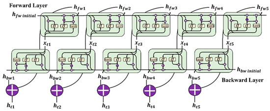 A basic bi-GRU network (Figure 4) has two single layers that propagate in inverse directions. The forward layer uses the first record in the input sequence as the beginning, while the backward layer uses the last record as its beginning. The overall state is the summation of the states from both of the layers; the final state can also be covered by an activation layer.