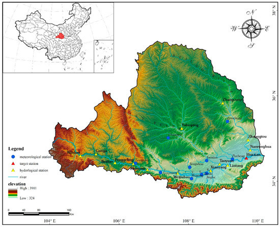 The Wei River basin (33° N~37° N, 104° E~110° E), which is mainly located in Shaanxi Province, China, has an area of 135.9 thousand square kilometers. It is a representative region in the western and northern parts of China. Located in a semi-humid to semi-arid warm temperature climate zone, the basin has a continental monsoon climate [61], and the elevation ranges from 324 m to 3911 m. The downstream region has annual precipitation ranges from 600~800 mm, while the annual precipitation at the upstream region ranges from 350~500 mm. The period from June to October accounts for 65~80% of the total annual precipitation. As a result, the downstream area is affected by flood events frequently. The basin accounts for 64% of the total population, 72% of the irrigation area, and 80% of the GDP in Shaanxi Province from socio-economical activities. Additionally, this basin is located at the Loess Plateau, which is very sensitive to soil erosion caused by rainfall-runoff processes. Hence, stable and reliable runoff forecasting can have high merit for flood warnings, water resources management, and water and soil conservation in this region. The Wei River is the largest tributary of the Huang River containing the main channel and two main branches (the Jing River and the Beiluo River).