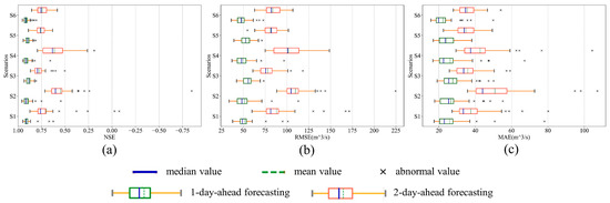 Box plots of the distribution of evaluation metrics in the validation stage. (a) Box plot of the distribution of NSE; (b) box plot of the distribution of RMSE; (c) box plot of the distribution of MAE.