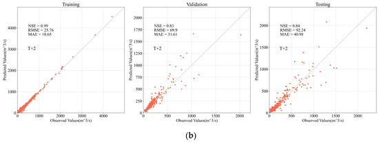 Figure 8 and Figure 9 is the scatter graph and the hydrograph of the best model considering the overall performance in the validation set and testing set for one-day-ahead forecasting and two-day-ahead forecasting. The NSE values in the validation set and the testing set all exceed 0.95, indicating that the model can provide runoff prediction with high precision. The results also suggest that though the forecasting accuracy declines significantly with the increasing lead time, the NSE values are still over 0.83, acceptable, and meaningful for practical use. Furthermore, the scatter plots and the hydrographs show that the apparent deviations are more likely to occur as the flowrate increases. This pattern is more evident in the T + 2 forecasting, in other words, in the forecasting with a longer lead time. From the aspect of the hydrological mechanism, the large flowrates in this research area are usually caused by intensive rainfall processes, in which the infiltration excess (Horton) runoff’s occupancy increases [63]. Since the Horton runoff process driven by intensive rainfalls has a relatively short duration [64], although the runoff data at the distant stations can partially explain the flowrate at the prediction target, it is still difficult for the models to accurately predict the large flowrate two days later. The performance comparison between T + 1 and T + 2 forecastings also shows that the rainfall and runoff data one day before the prediction date is valuable. This can be explained by the fact that in some rainfall-runoff events, the data’s time lags caused by the distance between the prediction target and some adjacent upstream stations are less than two days. Additionally, the deviations when dealing with large flowrates may also be caused by a fact that the weighting matrix does not take the seasonal variation of the rainfall-runoff mechanism [65] into account.