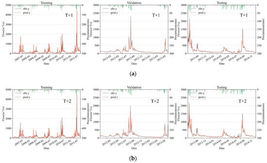 Hydrographs of the forecasting results for the best models. The green bars represent the rainfall data at the Pucheng meteorological station. (a) Hydrograph of one-day-ahead (T + 1) forecasting in the training, validation, and testing stage; (b) Hydrograph of two-day-ahead (T + 2) forecasting in the training, validation, and testing stage.
