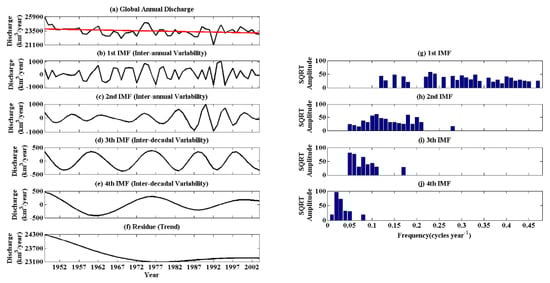 Annual global freshwater discharge from 1948 to 2004 (a), and its decomposition into four intrinsic mode functions (b–e) and trend (f) using ensemble empirical mode decomposition (EEMD). The red line in (a) represents the trend estimate using the Mann–Kendall (MK) method, and the power spectrum of each intrinsic mode function (IMF) is also shown in (g–j).