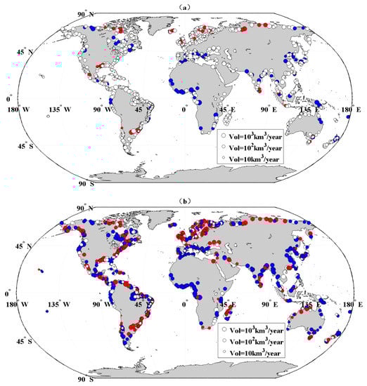 Trends of 925 river discharges to the ocean from 1948–2004 as estimated using MK (a) or EEMD (b) methods. Stations with significant upward (downward) trends are shown in red (blue), while white circles represent no significant trend. The log transform of annual volume discharge is proportional to the area of each circle, and each circle is located at the mouth of the watershed.