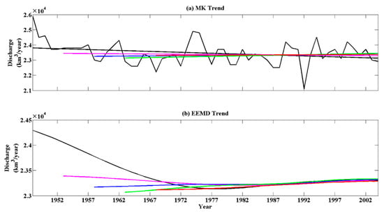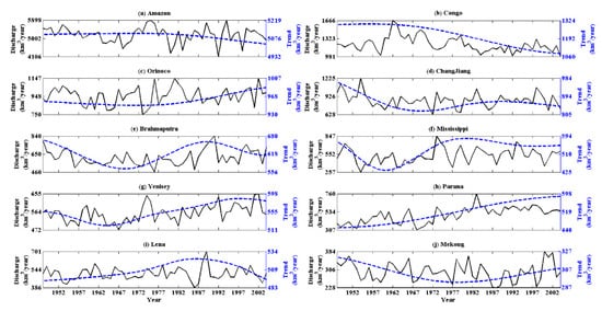 Our results have other implications, e.g., they provided a new idea to better quantify model simulation uncertainties. Land surface and hydrological models always simulate gridded runoff []. The model-simulated runoff may contain significant bias due to errors in the meteorological forcing data and model structure. However, runoff is difficult to measure directly, while discharge over most of the world’s major rivers has been monitored by stream gauges for many decades []. Thus, historical records of discharge provide a measure of basin-integrated runoff, and they have been used to calibrate model-simulated runoff field. Nevertheless, it is difficult for models to fully simulate the long-term time series of runoff/discharge. If the models can exactly simulate the long-term trend of runoff/discharge, they will also be of great reference value. Accurately identifying the discharge trend is the basis of the abovementioned model evaluations. In the future, it is necessary for model developers to not only reduce the uncertainties of time series modeled discharge, but also to accurately simulate the nonlinear discharge trend.