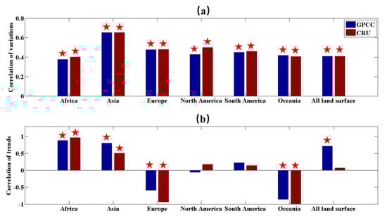 Correlations of (a) the detrended time series of annual precipitation and discharge from 1948 to 2004; (b) the trends of precipitation and discharge from 1948 to 2004; the red star represents significant correlation at the 95% level.