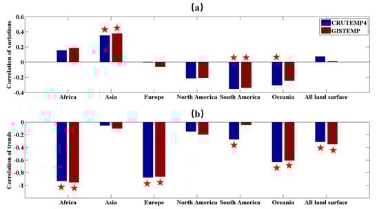 We also correlated the detrended and trend of discharge time series with two different products of global T. Correlations between the two detrended time series of discharge and T varied from region to region, being positive for African and Asian continents and negative for the other four continents. The correlation was only significant for Asia and South America for both products and Oceania for the CRUTEMP4 product. Globally, the detrended discharge was not significantly correlated with the detrended T for both temperature products (see Figure 5a). For the trends, T was negatively correlated with discharge across all six continents, and the correlation was only significant for Africa, Europe, and Oceania for both T products and South America for the CRUTEMP4 product (see Figure 5b). Globally, the trends of T and discharge were also significantly negatively correlated (see Figure 5b).