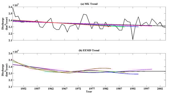 The estimated trend by EEMD can be sensitive to the data length. We compared the estimated trends using MK or EEMD methods for Dai’s global discharge data series with different ending and starting times (see Figure 6 and Figure 7). The discharge data included three periods with very high or low discharge rates, e.g., very high rates from 1948 to 1951 and from 1974 to 1975, and very low rates in 1992. The results in Figure 6 show that the estimated trends using the MK method were rather insensitive to the ending year. Depending on whether the two periods of very high (1974–1975) or low discharge (1992) were included or not, the trend estimated using EEMD could go up (see the red curve in Figure 6b) or down (see the blue curve in Figure 6b). Different sensitivities for the starting year of the estimated trends using the two methods are further illustrated in Figure 7. Overall, the linear trends as estimated using the MK method were not significantly different from zero. However, the estimated trend using the EEMD method could vary significantly, depending on whether the very high discharge period (1948–1951) was included or not. Only when the observed discharges of 1948–1951 were included, the trend in global discharge as estimated using the EEMD method decreased from 1948 to 1978 and then increased. The abnormally high discharge from 1948 to 1952 resulted in the global discharge time series being nonstationary with a nonlinear trend. This nonlinear trend was more accurately quantified using EEMD than using the MK method.