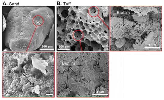 The large surface area and material porosity (internal porosity relative to the volume of ~30%) enabled the tuff to harbor a greater microbial biomass (compared to SAT-sand), while the large grain size (3–5 mm) may have provided a higher water permeability. Additionally, previous studies have suggested that the iron-rich tuff (due to its volcanic origin) enhances the adhesion of negatively charged organic material (including bacteria) due to a net positive charge [35]. The tuff’s high internal porosity may also increase the nutrient adsorption compared to the sand [36,37], thus supporting bacterial growth. It was previously reported that bacteria colonized the tuff almost immediately after natural water passed through the media [35]. However, it should be stressed that it may take several months to establish a mature and diverse microbial community on the tuff grains. Therefore, a maturation period in an operational infiltration pond is critical to allow the development of a native biofilm community, before testing the biodegradation efficiency of any new medium, including the tuff.