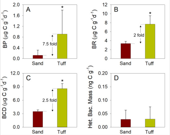 In contrast to the results for BP, those for BA indicated that the heterotrophic biomass values in the sand and maturated tuff were similar (Figure 3D). Therefore, it is surmised that the similarities in BA between the tuff and the sand were due to differences in the cell extraction process from the two media. Bacterial removal from the tuff and sand was performed via physicochemical processes (i.e., Ca+2 chelator and a short probe-sonication) to breakdown the extracellular matrix of the biofilm, and agitate and remove the attached cells from the grain surfaces [29,48]. Nonetheless, SEM imaging indicated that after 20 s of probe-sonication, the sand grains appeared almost bare, namely that all of the bacteria were removed from the surface (Figure S3A,B). In contrast, the deep pores and crevices of the tuff grains were extensively covered with bacterial biomass, after only 60 s of probe-sonication (Figure S3C,D). Removing and counting bacteria from solid surfaces using different physicochemical methods is challenging since the cells must be removed without damaging their structural integrity [49]. Hence, long durations of sonication or any other aggressive extraction methods cannot be used. Yet, according to the SEM images, it is clear that far more bacteria, as well as organic material, were attached to the tuff surface than to the sand (Figure S3).