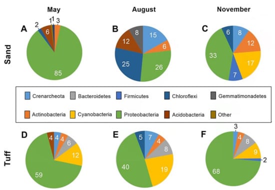 Community structures of the six most abundant phyla that constituted the biofilms associated with the sand and the tuff grains, during the three sampling periods. Analysis in community structure during the different sampling months collected from the sand (A–C) and tuff (D–F). All the numbers represent the percent operational taxonomic units (OTU) out of the total abundance.