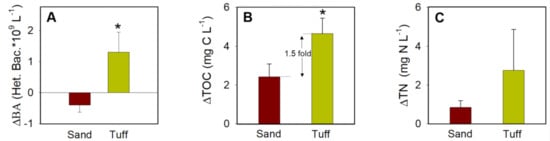 where X(T0) refers to the BA, TOC, and TN concentrations in the secondary effluent WW sampled from the SAT pond, which served as the feed solution (inflow) to the overall experiment. Concurrently, X(TF) refers to the BA, TOC, and TN concentrations of the collected outflow after percolation at an inflow flux of 1 m3 m−2 d−1 (values are shown in Table 2). The removal of total bacteria (ΔBA) from the WW feedwater was 2.5-fold greater after percolation through the tuff than the sand (Figure 5A). Moreover, it has been found that bacterial numbers were often higher in the sand effluent than the feedwater, leading to a negative ΔBA. These data indicate that the tuff not only settled more bacteria, but also had less bacterial detachment, leading to lower BA values in the outflow. This is in accordance with previous studies showing that biofilms in infiltration systems enhance the biomass removal by providing additional adsorption sites for both pathogens and other organic matter [12,35,63,64]. Differently, the higher BA measured in the sand outflow was likely due to the greater bacterial detachment rates from the sand than from the tuff (Figure 2). In contrast to the rough, the furrowed surface of the tuff (Figure 2), the shear forces of percolating feedwater lead to a higher detachment of cells from biofilms that grow on the SAT sand.