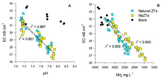 Relationship between electrical conductivity (EC) vs. pH (A) and EC vs. NH4 (B) in the treated pig-slurry. Black dots represent blank samples (no ZT added), cyan dots represent natural ZTs (all the grain sizes), while yellow squares represent NaZTs (all the grain sizes). Continuous regression lines refer to natural ZTs, while the dotted regression line refers to NaZTs. ZT: zeolite; NaZT: Na-exchanged zeolite.