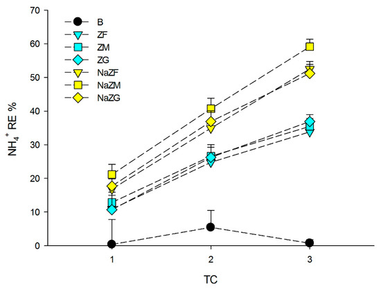 Removal Efficiency (RE %) of NH4+ among the three performed treatment cycles (TC) obtained during the experiments by treating the pig-slurry with natural ZTs in three grain sizes (ZF = grain size 0.1–0.7 mm, ZM = grain size 0.7–2.0 mm and ZG = grain size 2.0–5.0 mm) and Na-homoionic NaZTs in three grain sizes (NaZF = grain size 0.1–0.7 mm, NaZM = grain size 0.7–2.0 mm, and NaZG = grain size 2.0–5.0 mm). Error bars represent standard deviation.