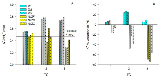(A) K+/NH4+ ratio variation among treatment cycles (TC) in all the tested samples, treated with natural ZTs in three grain sizes (ZF = grain size 0.1–0.7 mm, ZM = grain size 0.7–2.0 mm and ZG = grain size 2.0–5.0 mm) and Na-homoionic NaZTs in three grain sizes (NaZF = grain size 0.1–0.7 mm, NaZM = grain size 0.7–2.0 mm, and NaZG = grain size 2.0–5.0 mm; (B) % of K+ variation with respect to the initial values in the pig-slurry among the TCs in all the samples treated with natural and NaZTs.