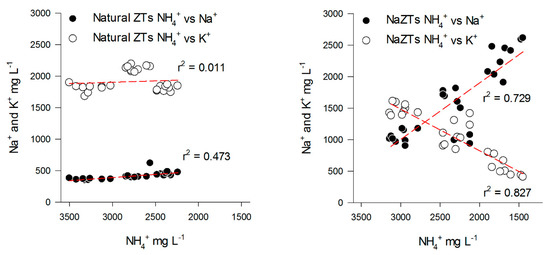 Relationships between Na+ vs. NH4+ (black dots) and K+ vs. NH4+ (white dots) in the samples treated with NaZTs (all the grain sizes together). Red dotted lines represent linear regressions.