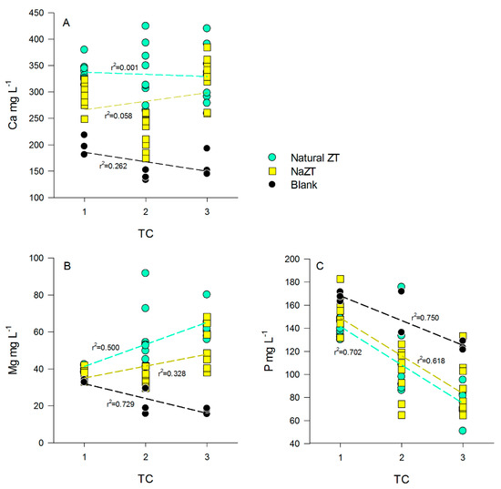 Relationship between Ca2+ (A), Mg2+ (B), and P (C) vs. the number of treatment cycles (TC) in the treated pig-slurry (PS). Black dots and black regression lines represent blank samples (no ZT added), cyan dots and regression lines to natural ZTs (all the grain sizes), while yellow squares and regression lines to NaZTs (all the grain sizes).