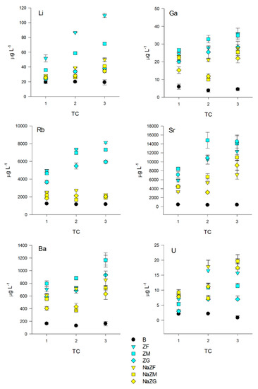 Dynamics of Li, Ga, Rb, Sr, Ba, and U among the three treatment cycles (TC) of the pig-slurry treated with natural ZTs in three grain sizes (ZF = grain size 0.1–0.7 mm, ZM = grain size 0.7–2.0 mm and ZG = grain size 2.0–5.0 mm) and Na-homoionic NaZTs in three grain sizes (NaZF = grain size 0.1–0.7 mm, NaZM = grain size 0.7–2.0 mm, and NaZG = grain size 2.0–5.0 mm)and in the blank samples (without the addition of ZTs).