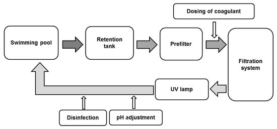 The operation of modern swimming pool systems is based on closed water circulation with active overflow and treatment in the installation, as presented in Figure 1. In public swimming pools, the obligatory process of swimming pool water treatment is the disinfection with chlorine compounds due to the antiseptic effect of so-called “free chlorine”, and its ability to oxidize organic and inorganic compounds. As a side effect of this method, disinfection by-products (DBP) are formed [,,,,].