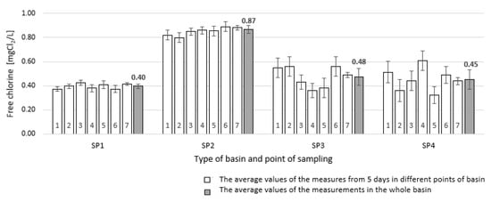 That indicates a better mixing of water in the vertical hydraulic system of water flow (SP1 and SP2) than in the horizontal system (SP3 and SP4). In every case, chlorine content in the central part of the pool (point 7) was the most similar to the average value for the whole basin, which indicates that mixing of water is best in the central part of the pool.