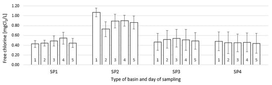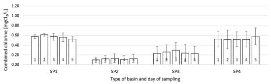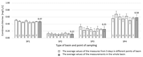 In all tested basins, there was a large variation in the chlorine content, depending on both the point of sampling and the day of measurement. The statistical analyzes were performed in MS Excel. The difference test and median test between mean values were carried out at the assumed level of significance α = 0.05. The distribution of free and combined chlorine in the selected points of the basins is shown in Figure 3 and Figure 4, respectively. The presented results are the average values of the measurements from 5 days. It can be observed that the average variability (measured as the standard deviation of free chlorine content, SD) due to the point of sampling in SP1 (SD = 0.02) and SP2 (SD = 0.03) was lower than in SP3 (SD = 0.07) and SP4 (SD = 0.08).