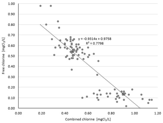 Figure 5 presents the correlation between the content of free chlorine and the combined chlorine in the tested pools. The calculated r-Person correlation coefficient was equal to 0.883, which means that the correlation between the content of free and combined chlorine is significant. The formula of the regression equation with the coefficient of determination is presented in Figure 5.