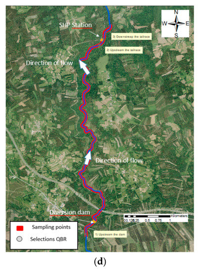 To calculate the QBR index, the Munné protocol [36] was followed, but with some modifications to be adapted to the tree species composition of our study area. A river stretch of 400 m around the dam, and another river stretch of 650 m around the SHP plant and tail race were selected. These reaches were divided into sections with similar characteristics, and the QBR was calculated for each one. Points between two sections with different QBR were located with GPS. We calculated one QBR index for each river bank. Based on the index, it is not necessary to apply it to all the banks, but it is recommended to choose strategic points according to their characteristics. In this study, the riparian vegetation was evaluated in the points where some direct affections were made (because of the construction phase). Intermediate points were considered in these cases where topographic conditions allow access to the river. In this last case, the embalming of the waters, due to the installation of the plants, will make the vegetation to change. However, it will be necessary for a considered period of time to evaluate these changes. The sampling period was carried out between December 2007 and November 2010. The physicochemical parameters and the biological quality of the water were sampled every three months, in March, June, September and December. Directed sampling has been performed—simple samples were collected in triplicate, and at the points already described. The samples were collected in amber borosilicate glass bottles previously washed with sample water. The QBR index was calculated every six months, in March and in September.
