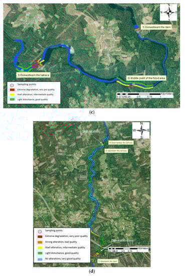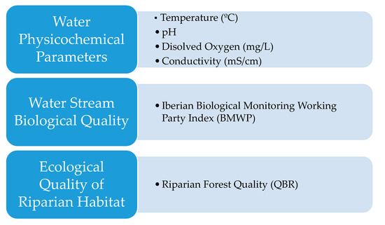 The Riparian Forest Quality index (QBR) was used to assess the ecological quality of the riparian habitats [36] (Figure 2). This index varies between 0 and 100, and it is based on four components of riparian habitat: Total riparian vegetation cover, cover structure, cover quality and channel alterations for the different geomorphology of the river from its headwaters to the lower reaches. After completing the analysis, the sum of scores for the four components gives the final QBR index. The QBR index, despite being developed for Mediterranean forests can be adapted to other types of riverside forests, as they have done in other studies [37,38,39].