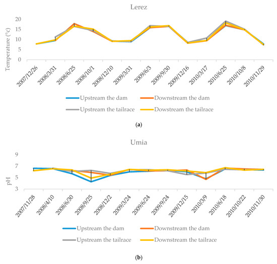 The Directive 2000/60/EC by The European Parliament [30], which establishes the framework in the field of water policy within the EU, was used in this work to assess the water status affected by the SHP plants. Thus, some of the water quality elements described in the directive were considered for this study. The physicochemical parameters taken into consideration were water temperature (T, °C), conductivity (mS/cm), dissolved oxygen (DO, mg/L) and pH (Figure 2).