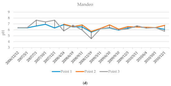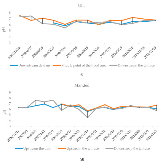 pH values measured during the survey period at (a) Lerez (San Xusto plant), (b) Umia (Hermida plant), (c) Ulla (Touro plant) and (d) Mandeo (Gomil plant).
