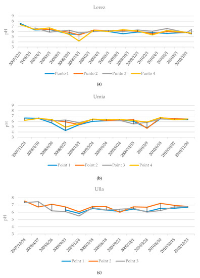 The low pH values obtained for some of the points could be explained by the natural characteristics of the waters in Galicia, which are generally acidic [46].
