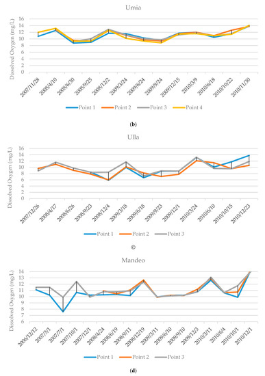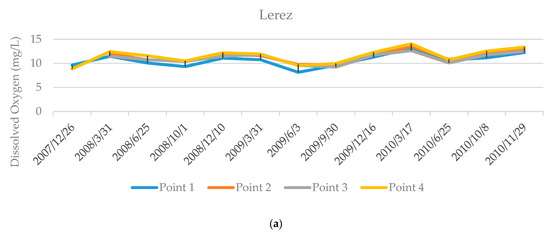 Dissolved oxygen values measured during the survey period at (a) Lerez (San Xusto plant), (b) Umia (Hermida plant), (c) Ulla (Touro plant) and (d) Mandeo (Gomil plant).