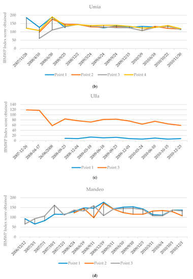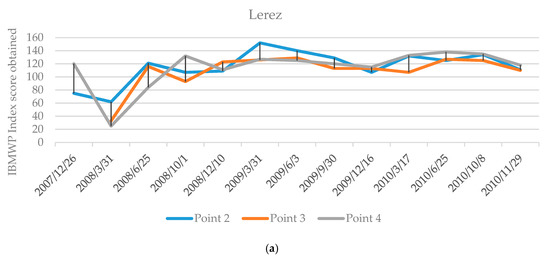 The Iberian Biological Monitoring Working Party index (BMWP) score system was introduced in 1980 to provide an index of river water quality for England and Wales based on aquatic macroinvertebrates, was used to assess the biological quality of the water [31,32] (Figure 2). To do this, the taxa of macho-benthonic fauna found in the sampled areas were identified to the family level, a predefined score was allocated for each family, and the total BMWP score for a sample was the summation of the scores of all the families found. The scores of the BMWP (0–>100) were grouped in 5 quality classes [31]. In Ulla river, the Iberian Bio-monitoring Working Party index (IBMWP index) was applied in 1 and 3 sample sites because 2 and 4 were very deep waters, due to the embalming effect. The conditions are not suitable for collecting macroinvertebrates. IBMWP scores were then compared with conditions in Cantabric-Atlantic quality elements at high ecological status [33]. This index obtained optimal results in Thailand [34] United Kingdom [35], among others.