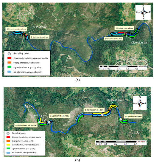Renewable energies, such as the one provided by SPH are a clean source of energy. Regarding the four plants studied in the present work, it must be taken into account that their installation in the last decades was done without prior planning, and without any specific studies and analyses on the ecological quality of the river environment. Therefore, without these previous studies, it is very difficult to predict and know what impacts these SPHs have on the ecosystem.