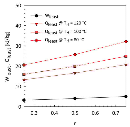 Equations (1) and (2) report these minimum values, where r is the recovery ratio, T0 and TH are the temperature of the “cold” (ambient) and “hot” (highest temperature available) thermal sources, as defined by Mistry et al. []. These depend on the free Gibbs energy of the feed (gf), the concentrate (gc) and the product (gp) (distilled or desalinated water in the case of desalination processes). Figure 1 depicts the minimum values for both work-driven desalination and thermal processes at different temperatures.